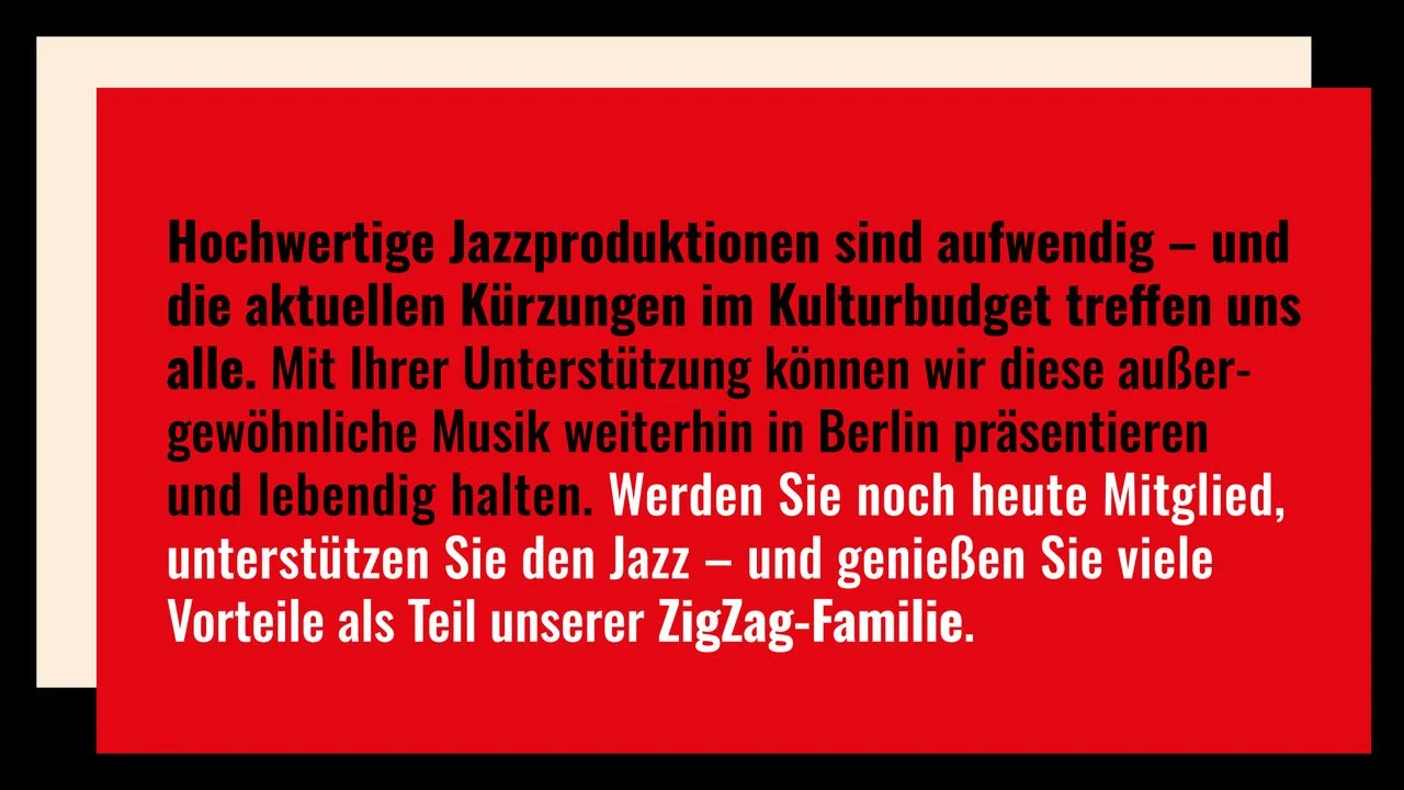 Im Jahr 2024 haben wir den gemeinnützigen Verein Berlin Jazz Kultur e.V. gegründet, der nun als Dachorganisation für alle Konzertaktivitäten im Zig Zag Jazz Club sowie an weiteren Partnerstandorten in Berlin dient. In den vergangenen Jahren konnten wir dank verschiedener öffentlicher Förderprogramme einige der bedeutendsten Jazzmusiker*innen der Welt präsentieren. Durch die aktuellen Kürzungen im Kulturbereich wird es jedoch zunehmend schwieriger, derart hochkarätige Produktionen zu realisieren.