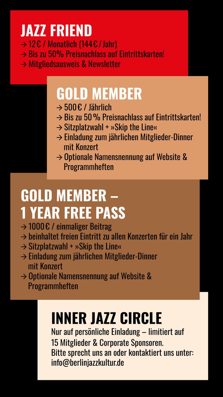 Unser Ziel ist es, ein nachhaltiges Modell zu etablieren – ähnlich wie bei führenden Jazzclubs in Deutschland, etwa der Unterfahrt in München mit über 1.000 Mitgliedern, dem Bix in Stuttgart und anderen –, die durch starke Community-Unterstützung hochwertige Programme ermöglichen. Mit jährlich mehr als 100 internationalen Top-Acts ist Ihr Beitrag entscheidend, um auch künftig Jazz auf Weltklasse-Niveau in Berlin präsentieren zu können. Bereits ab 12 Euro im Monat und mit zahlreichen attraktiven Mitgliedsvorteilen helfen Sie dabei, den Jazz in Berlin lebendig und präsent zu halten – für viele Jahre!